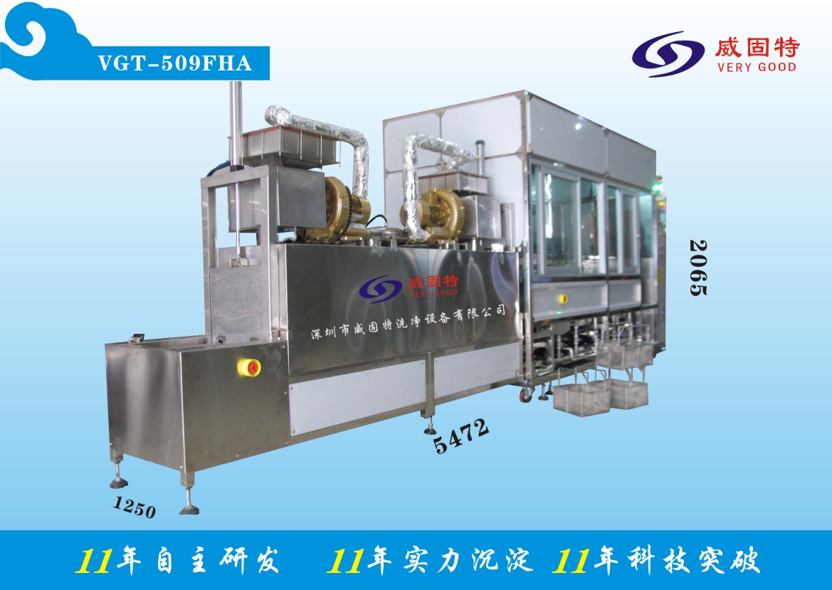 威固特VGT-509FHA活塞配件自動(dòng)智能式超聲波清洗機(jī)清洗流程:自動(dòng)上料→1超聲粗洗28K→2超聲精洗40K→3超聲純水漂洗28K→4超聲DI純水漂洗40K→5熱風(fēng)烘干→自動(dòng)下料。